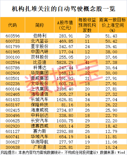 从机构关注度方面来看,获得券商机构“积极型”评级(含买入、增持、强烈推荐等)家数在10家及以上的自动驾驶概念股有34只。机构青睐程度居前的是比亚迪、长城汽车、豪威集团、拓普集团、长安汽车。