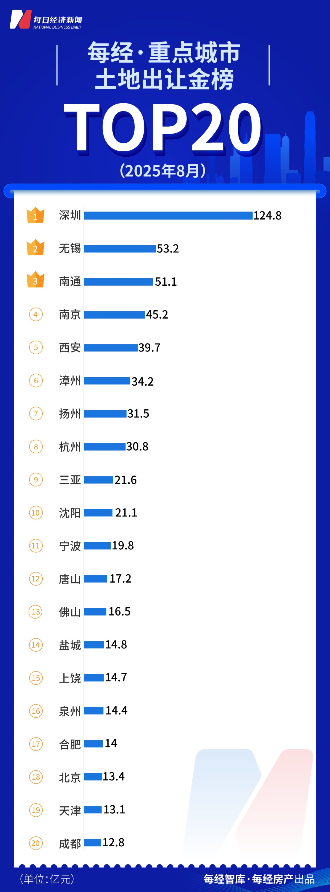 8月,仅深圳土地出让金超百亿元,无锡、南通土地出让金超50亿元;合肥、成都、北京等热点城市排名靠后,上海未能入榜。