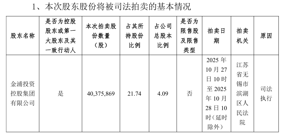 公告称,本次司法拍卖系因申请执行人宁波海广资产管理有限公司与被执行人金浦集团债务纠纷,江苏省无锡市滨湖区人民法院根据有关法律的规定作出相关裁定。