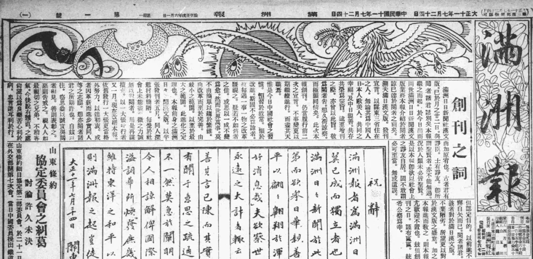 《满洲报》创刊号上报头写明发行人西片朝三;编辑人白玉田;印刷人魏日盛;发行所满洲报社,地址在大连市东公园町17番地。《满洲报》在《创刊之词》中宣称:“以谋东三省住在之人——无论其为中国人日本人欧美人——共同之幸福,及中日亲善,共存共荣为宗旨。”可见其创刊意图是为了诱导舆论,来缓和中国民众的反日情绪和高涨的民族主义浪潮。