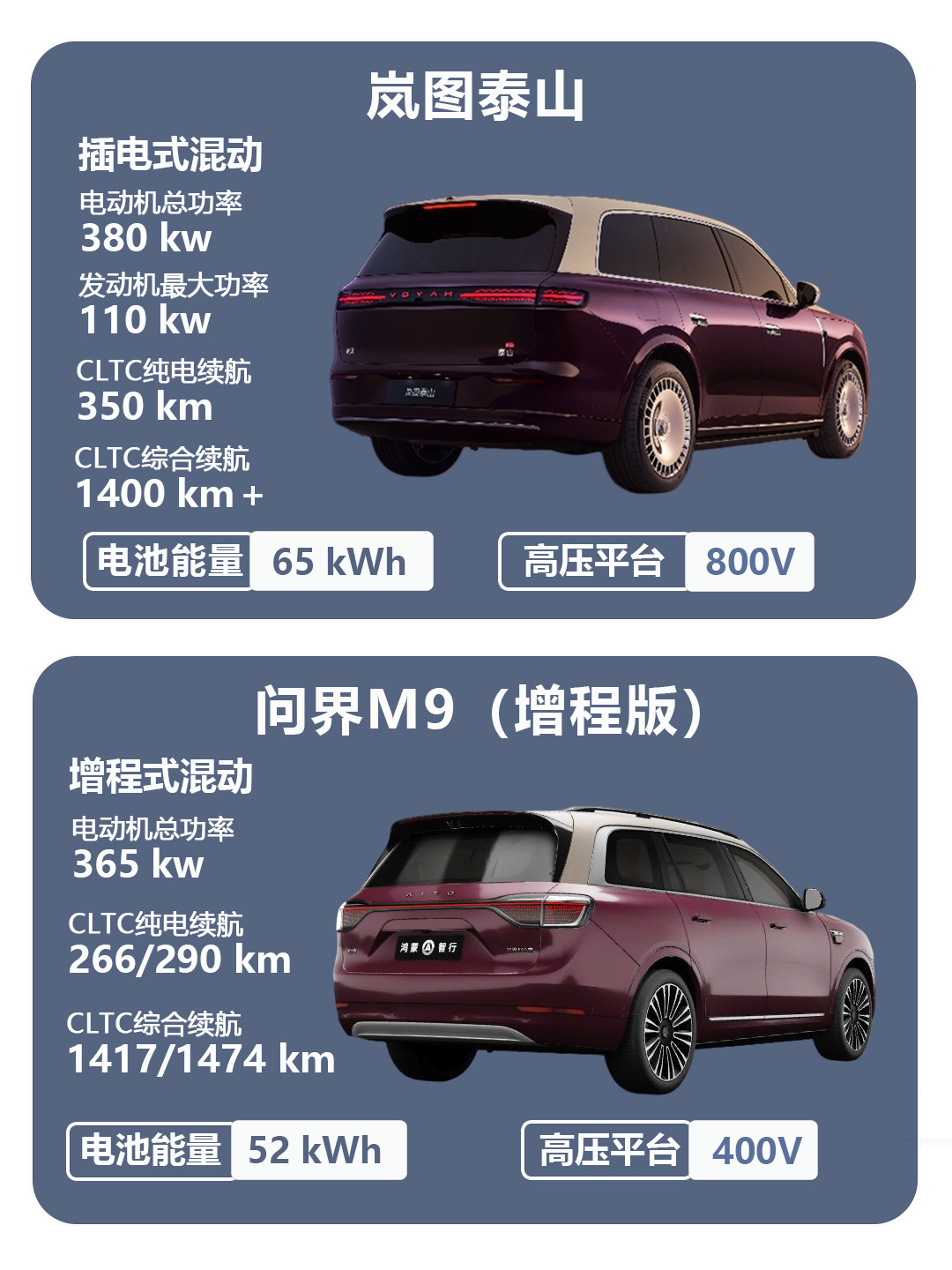 岚图泰山:插混动力,1.5T发动机+双电机,发动机最大功率110kW,电机总功率380kW,标配65度大电池,350km超长纯电续航,日常通勤完全可以纯电搞定,充电频率更低,大大提升出行效率,综合续航1400km+,800V平台+5C超充,20%-80%补电12分钟,长途出行里程零焦虑。